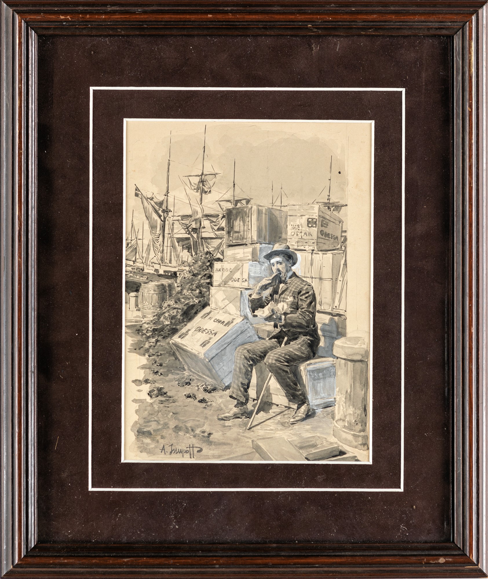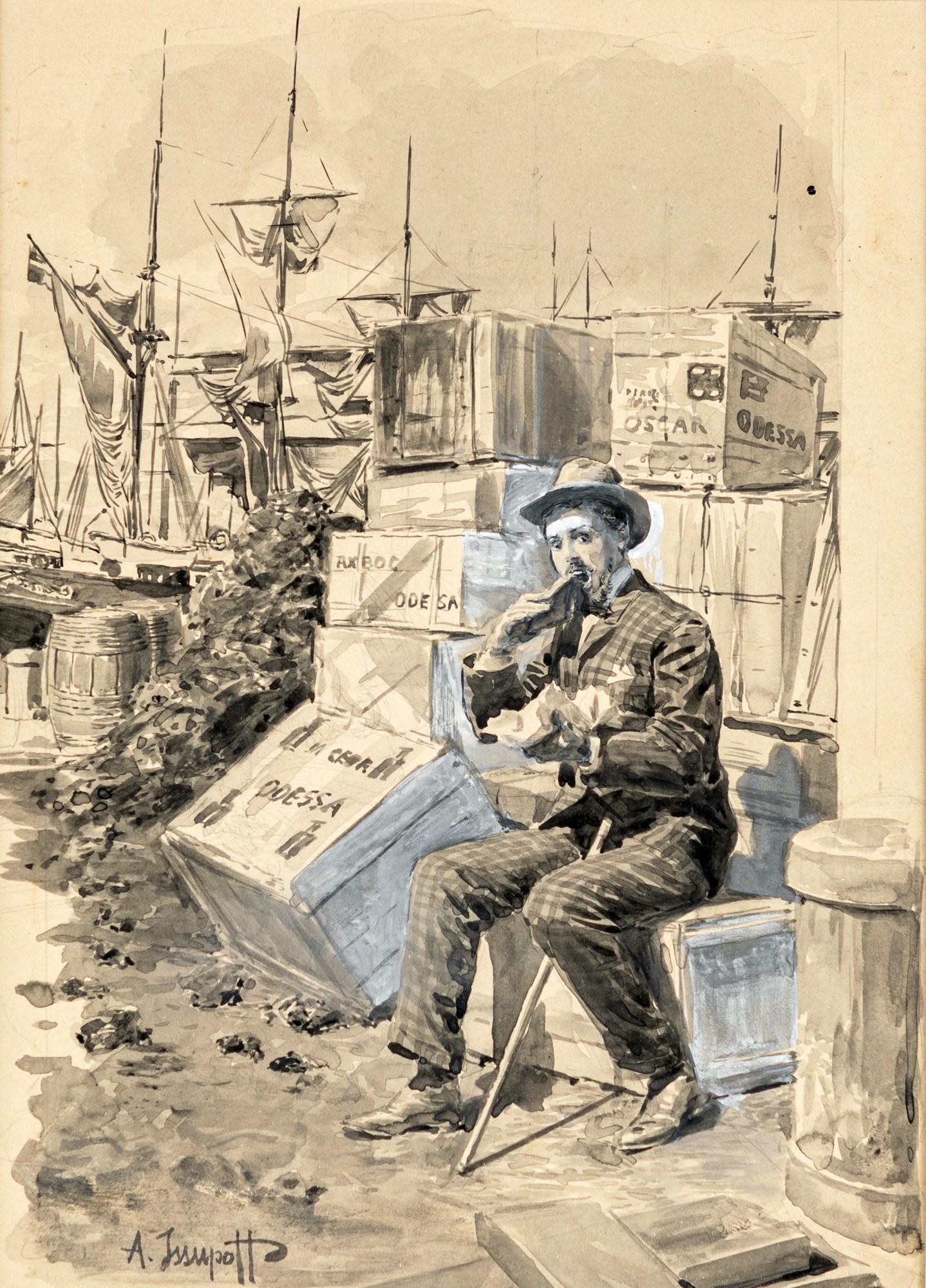 L'Imbarco da Odessa - Tavola per illustrazione acquarello e tempera su carta mm 300x190 - in cornice 40x33,5 Firmato in basso a sinistra "A. Issupoff"