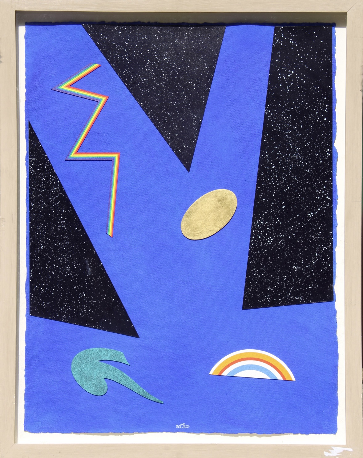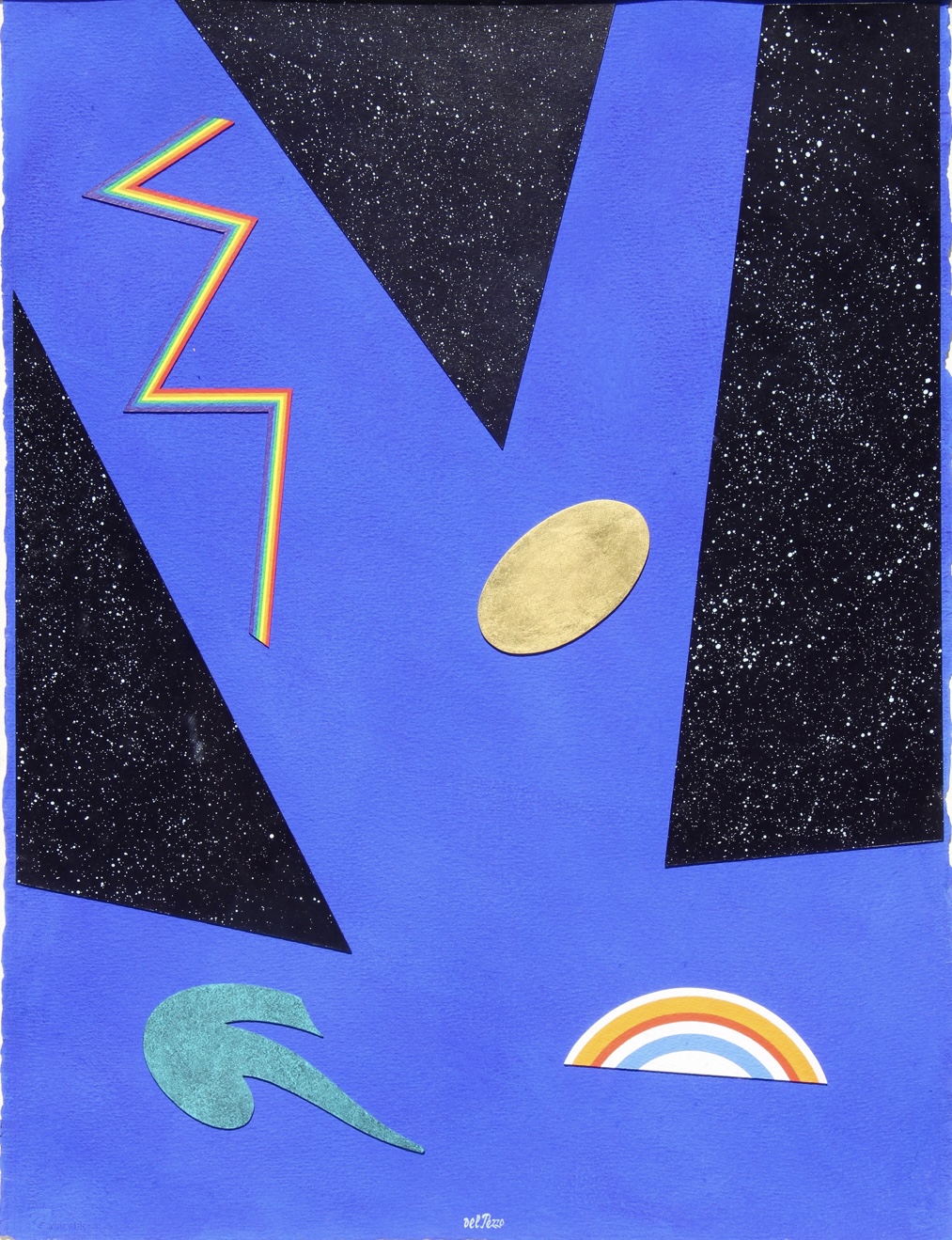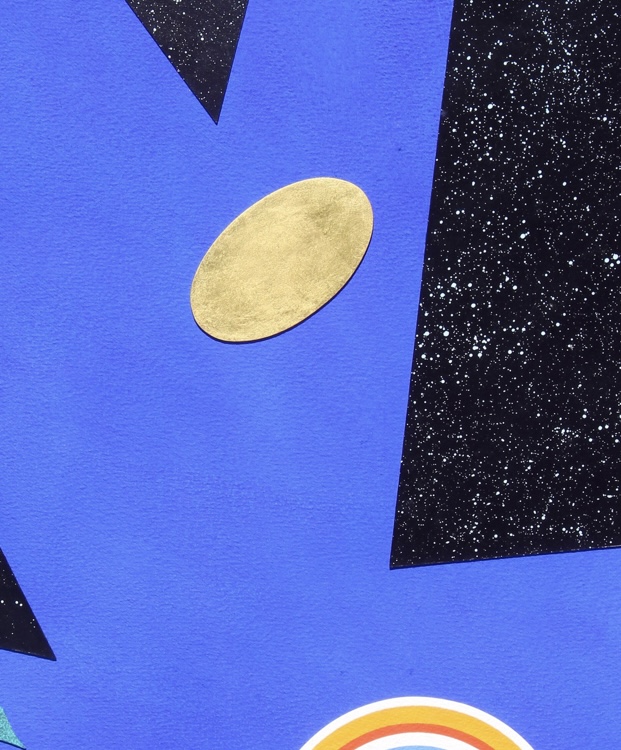Collage, colore acrilico, acquarello, oroi n foglie su cartoncino