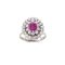 18 Kt white gold ring with round diamonds totalling approx. 1 ct, surrounding an oval ruby of approx. 1 ct