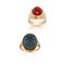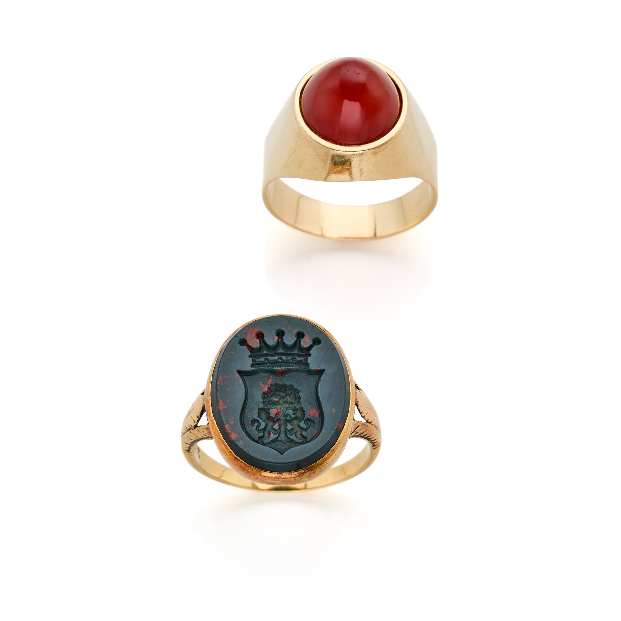 Lotto composto da due anelli in oro giallo 18 Kt di cui uno con sigillo, l'altro con corniola tonda cabochon