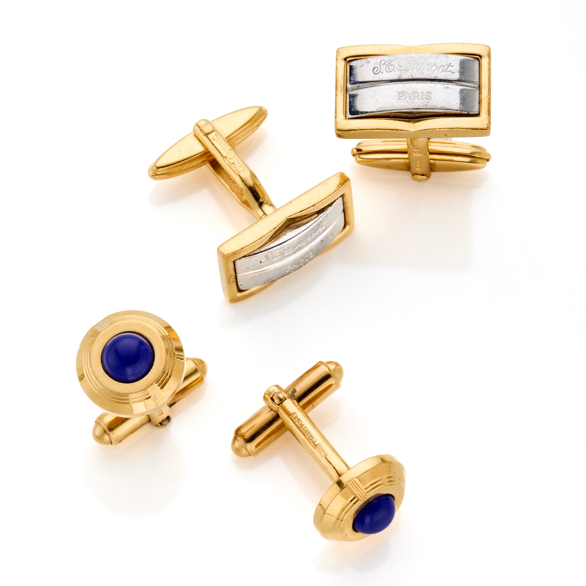 Lot composed of vintage Christofle gold plated cufflinks and golden and silver metal S. T. Dupont cufflinks.