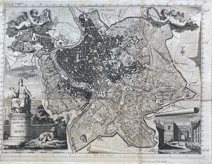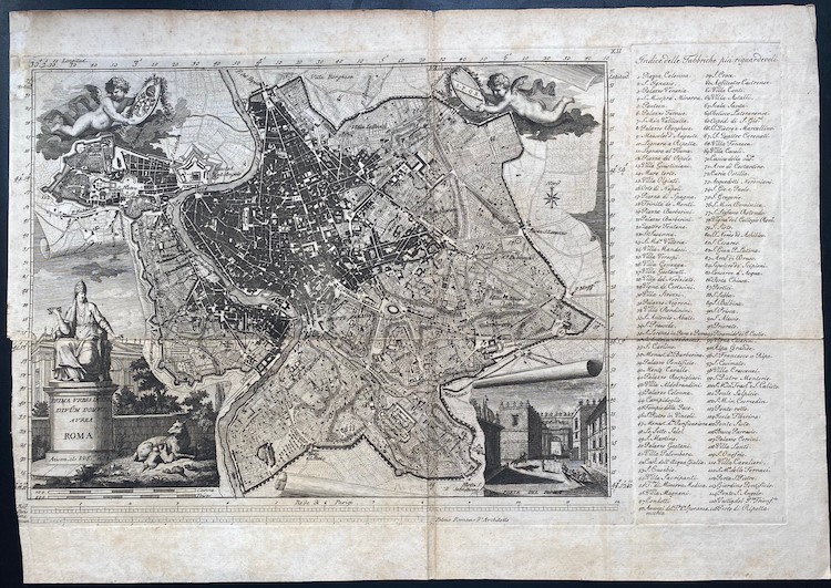 acquaforte, 312 x 445 mm. Riduzione di una famosa pianta di Roma di Noli, con indice.