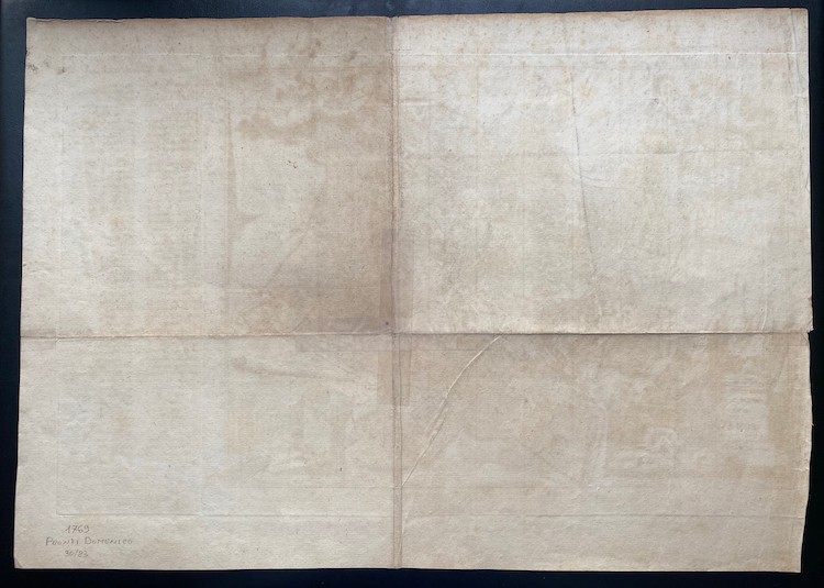 Bella impressione su carta vergata. Un piega verticale e una orizzontale. Usure lungo le pieghe. Leggera fioritura. Margine sinistro mancante (anche una millimetrica mancanza della parte impressa della lastra in basso a sinistra).