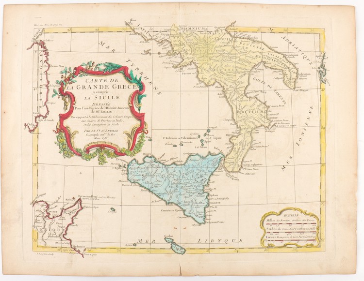 Carte de la Grande Grèce, y compris la Sicile, dressée pour l'intelligence de l'Histoire Ancienne de Mr. Rollin..., par le S[ieur] d'Anville, Géographe ord[inaire] du Roi; Mars 1738