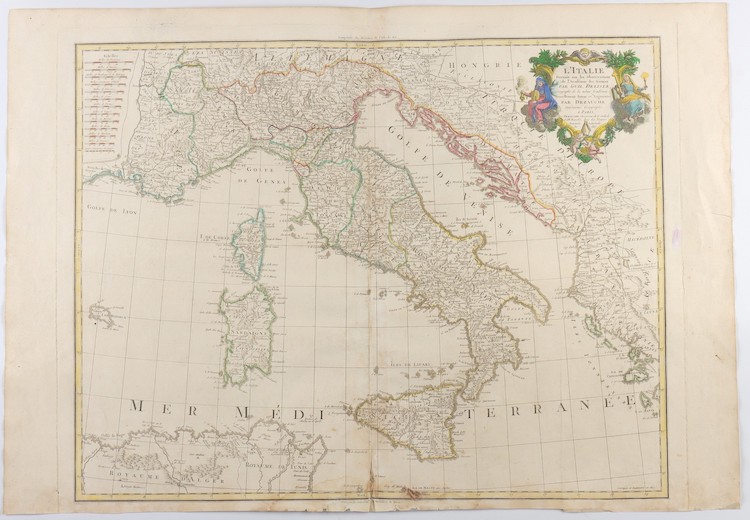 Grande mappa dell'Italia stampata su due fogli uniti di carta vergata spessa, cadauna con filigrana. Consueta piega centrale. Cartiglio figurativo colorato a mano. Margini preservati.