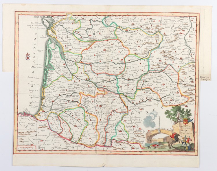 Acquaforte, 374 x 484 mm. Mappa della parte sud-occidentale della Francia, con un bel cartiglio decorativo.