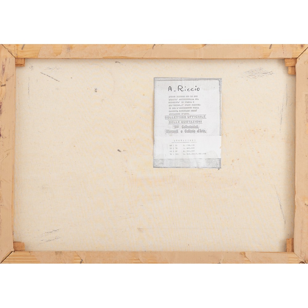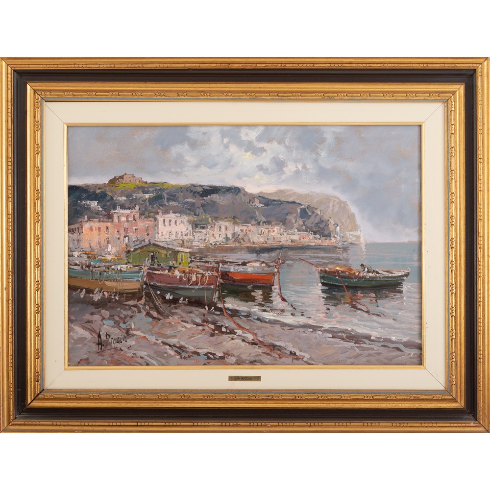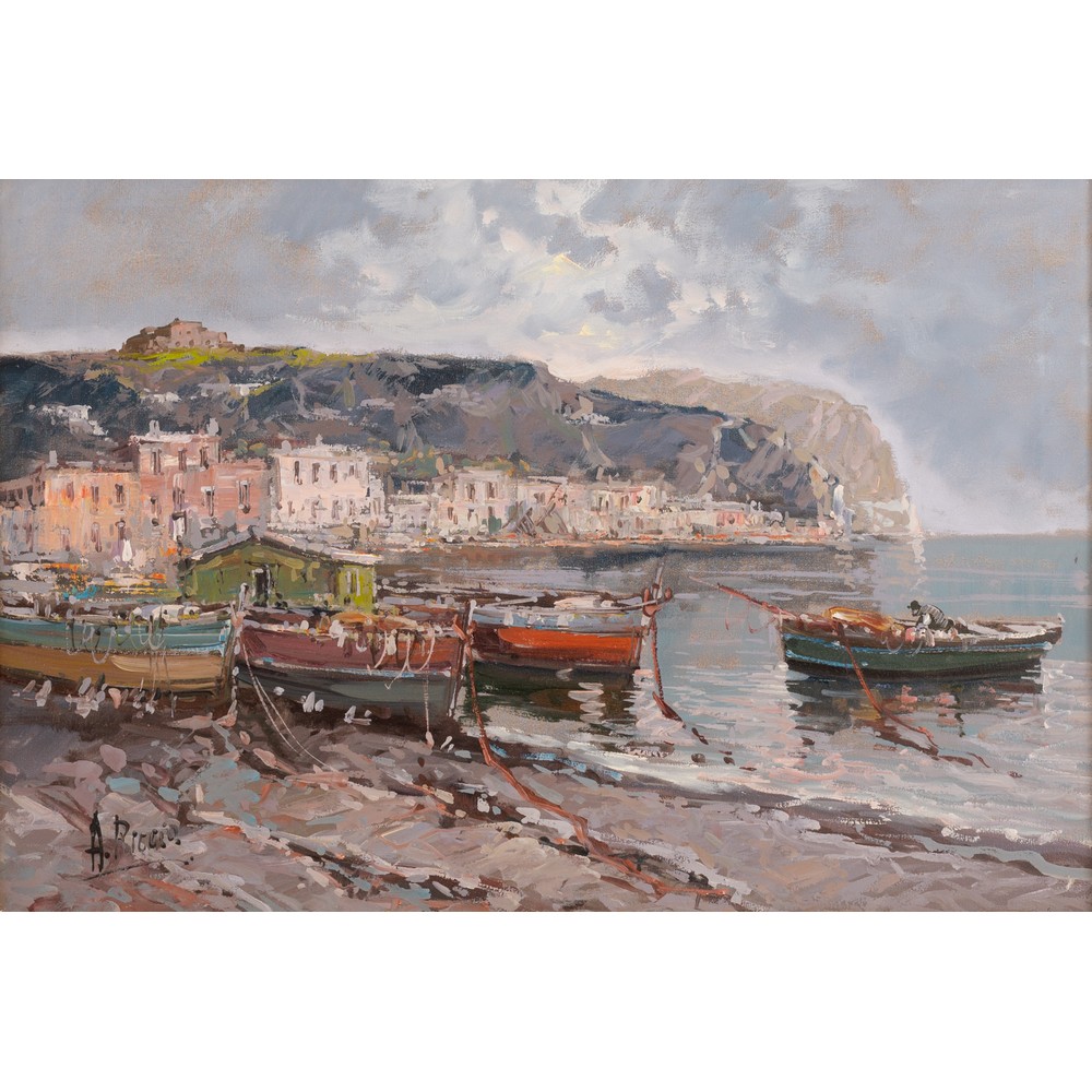 ANTONIO RICCIO, Paesaggio costiero con barche, Olio su tela
