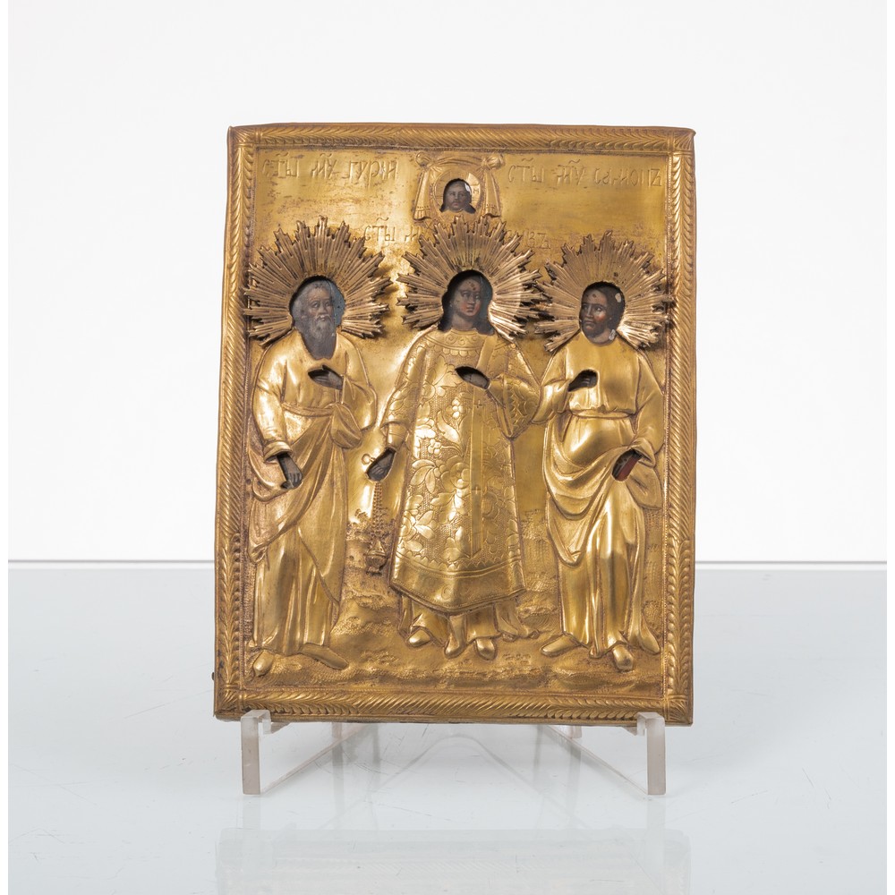 Icona in legno raffigurante "Santi" con rizza in metallo dorato.