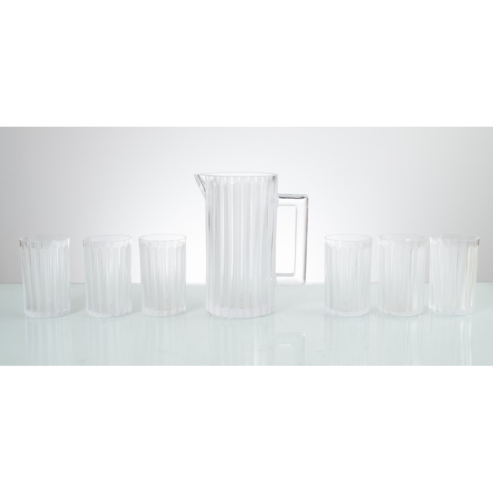 Brocca e sei bicchieri modello "Jaffa" in cristallo stampato e satinato con decorazioni scanalate.