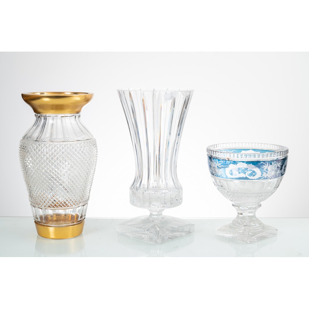 Due vasi in cristallo di cui uno lumeggiato in oro e coppa in cristallo lavorato.