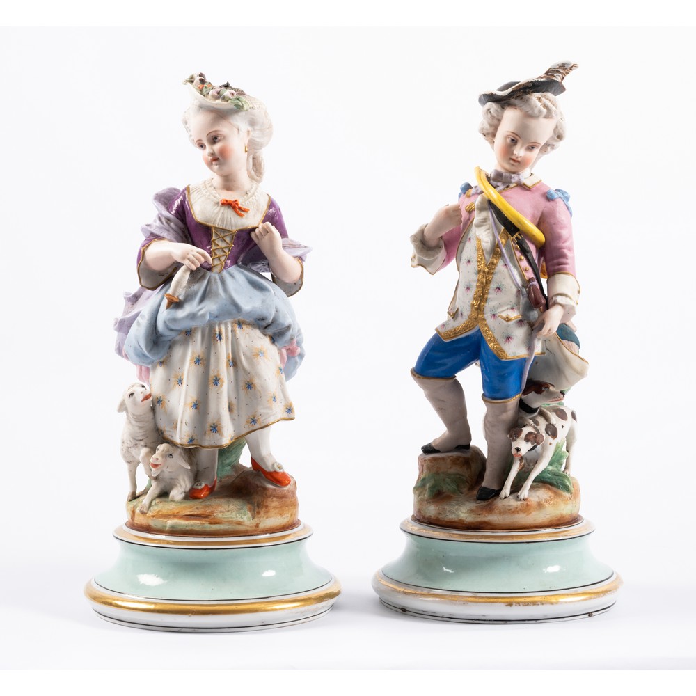 Coppia di sculture in porcellana vecchia Parigi raffiguranti "Bambini in costume con animali".