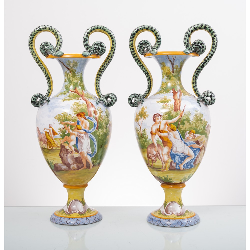 COPPIA DI VASI in ceramica smaltata e decorata a motivo mitologico (restauro).