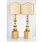 Coppia di torcieri elettrificati in legno dorato con ventole in tessuto e basi in legno rivestite in tessuto.