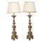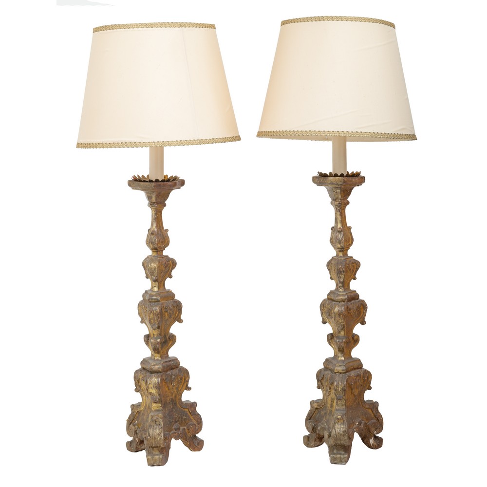 Coppia di torcieri elettrificati in legno scolpito e dorato ad argento a mecca con paralumi.