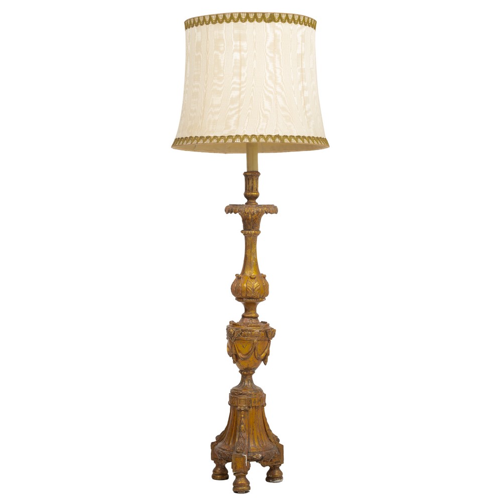 Torciere da terra elettrificato in legno dorato ad oro zecchino con paralume in tessuto.