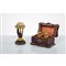 Portaspilli con scultura raffigurante "Aquila" in bronzo e cofanetto in legno contenente due bottiglie rivestite in metallo dorato.
