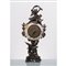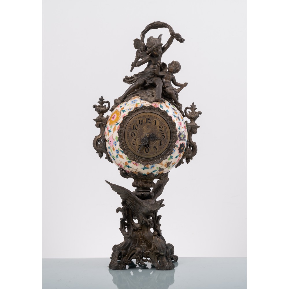 Pendola in metallo brunito con quadrante in ceramica smaltata e decorata, base raffigurante "Aquila" e parte superiore raffigurante "Putti".