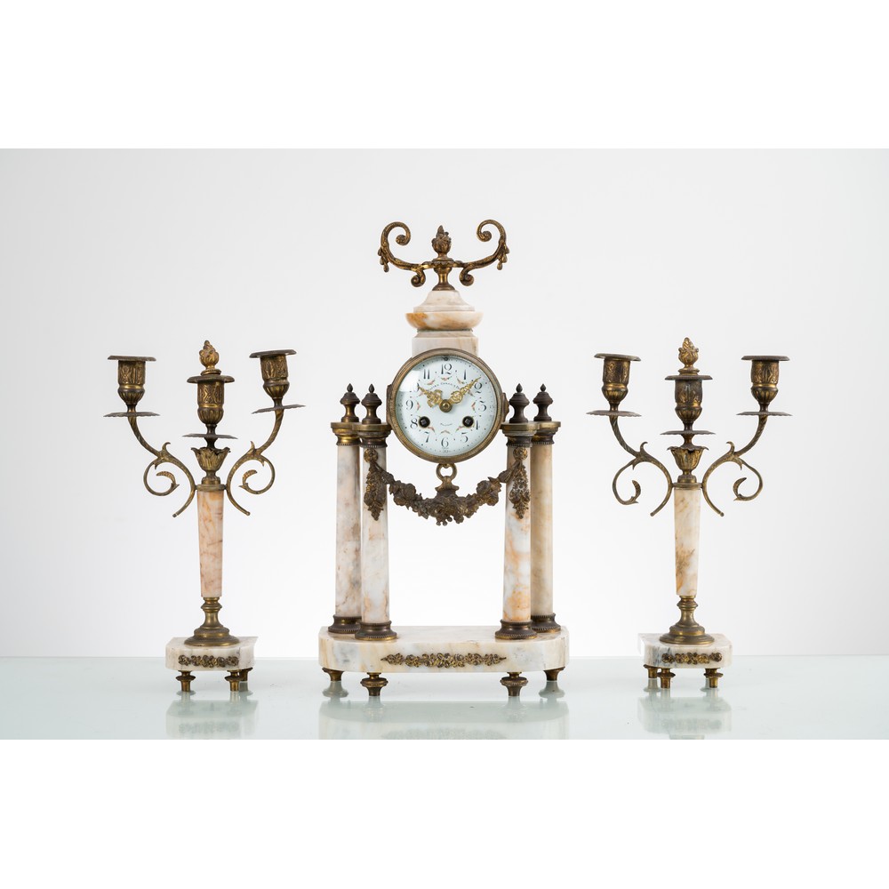 Trittico composto da orologio a modo di tempietto e due candelabri a tre fiamme in marmo e bronzo brunito.