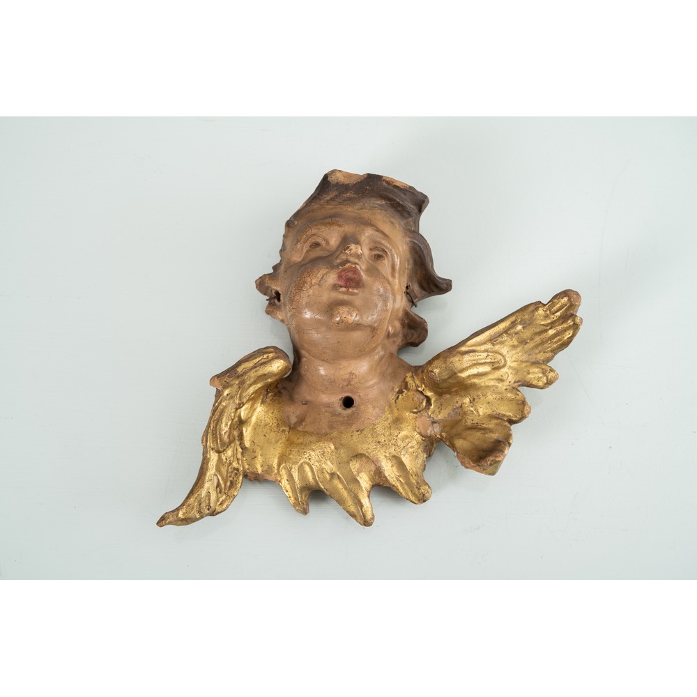 Scultura in terracotta dipinta e dorata raffigurante "Testa di putto alato" (mancanze).