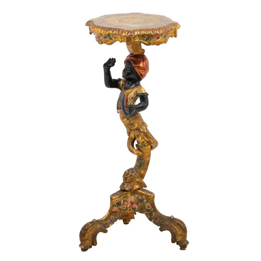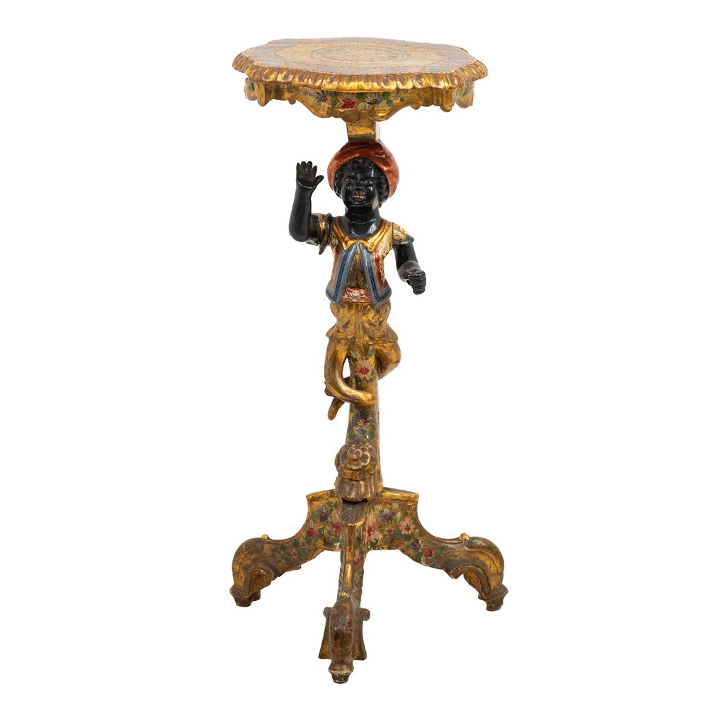 Virgola in legno intagliato, dorato e decorato sorretta da moro.