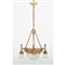 Lampadario a quattro luci in ottone con coppa centrale e bocce in vetro.