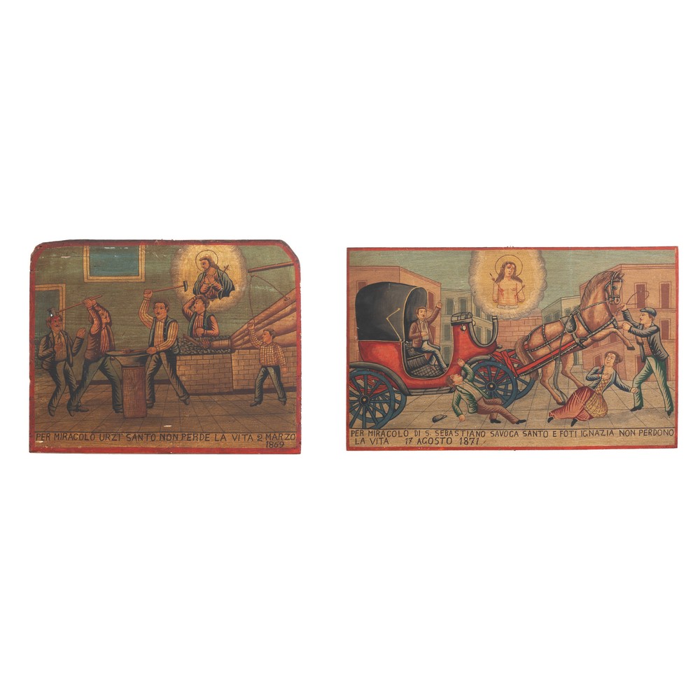 Due pannelli in legno dipinto raffiguranti "Ex Voto".