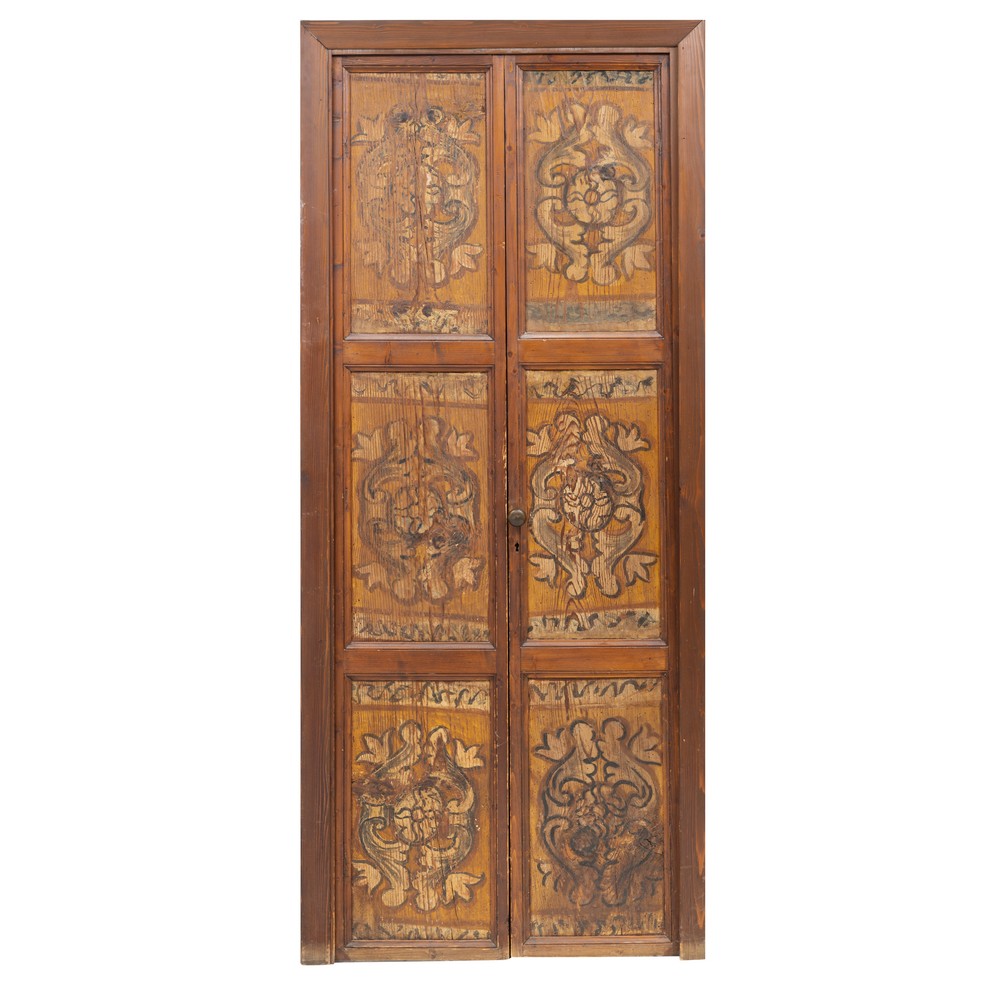 PORTA a due ante con pannelli in legno laccato e dipinto.
