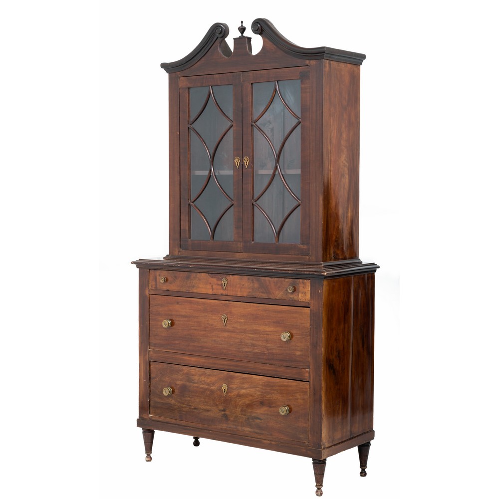 VETRINA a due ante con cassettiera nella parte sottostante di gusto Inglese in legno di mogano e piuma di mogano.