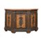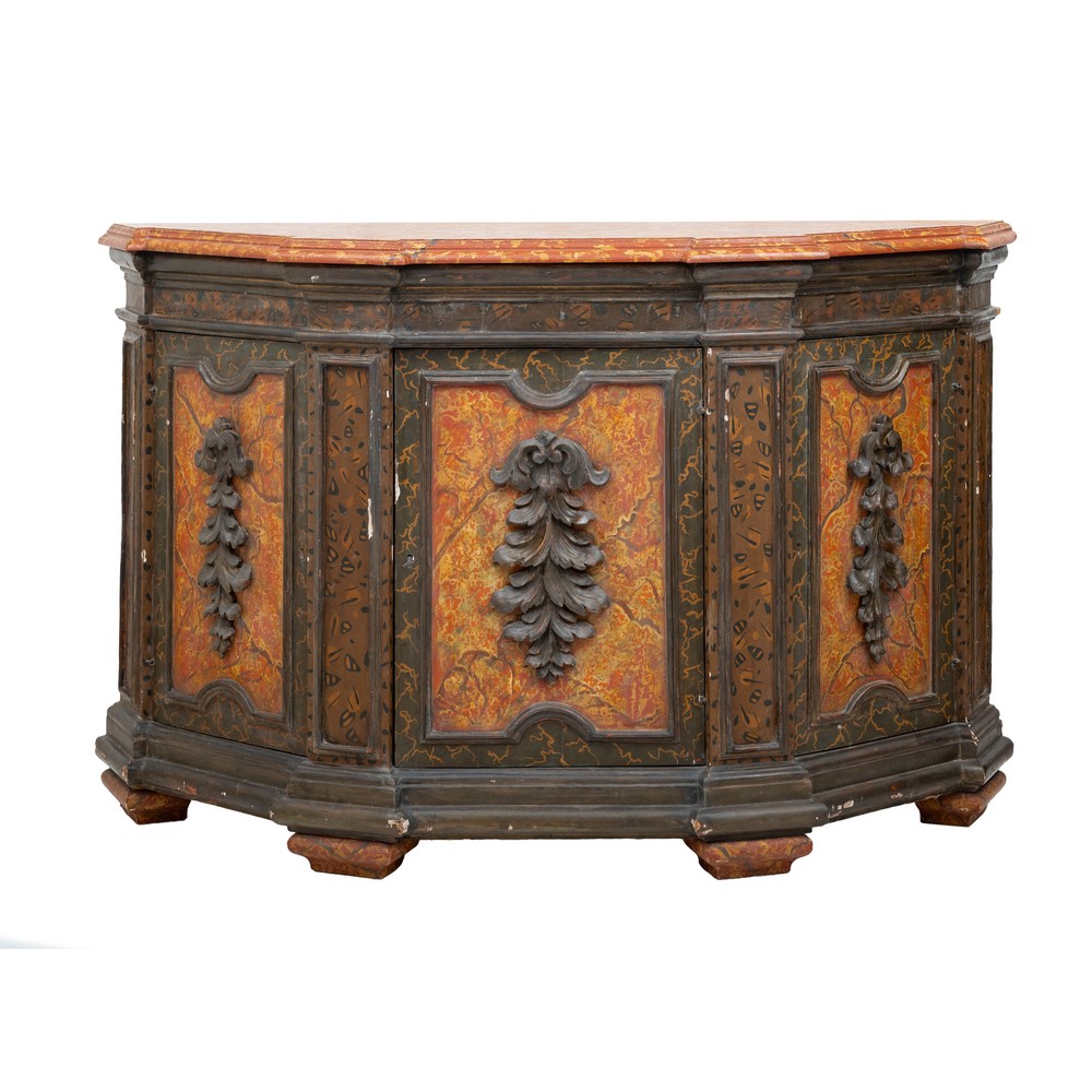 CREDENZA scantonata in legno laccato e dipinto con piano decorato a finto marmo.