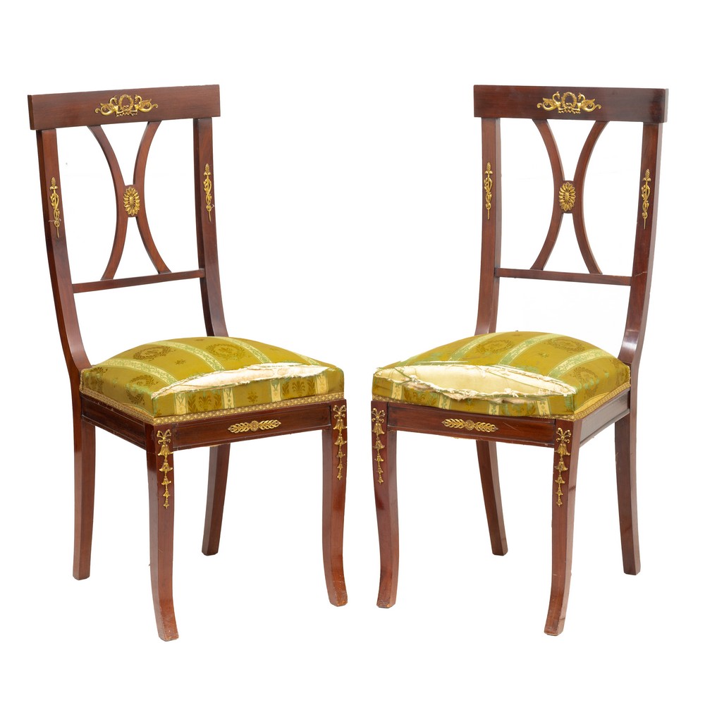 Coppia di sedie stile Impero in legno di mogano con fregi in bronzo dorato.