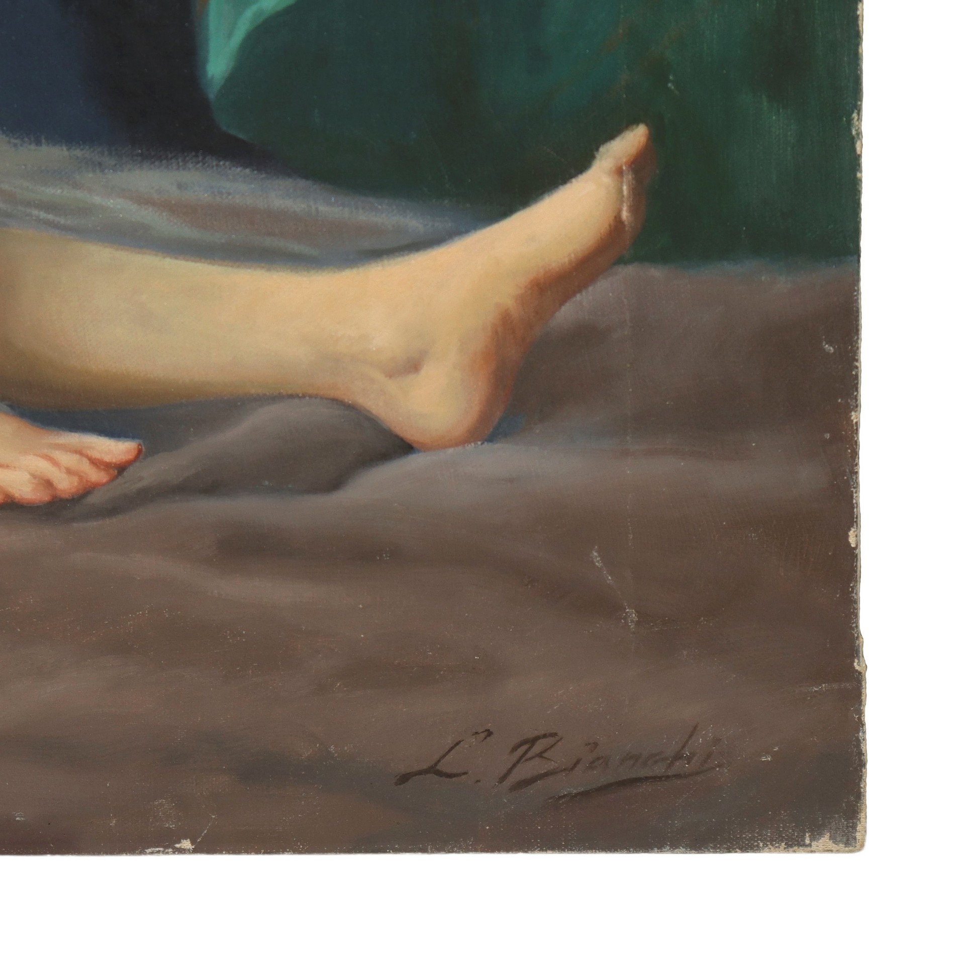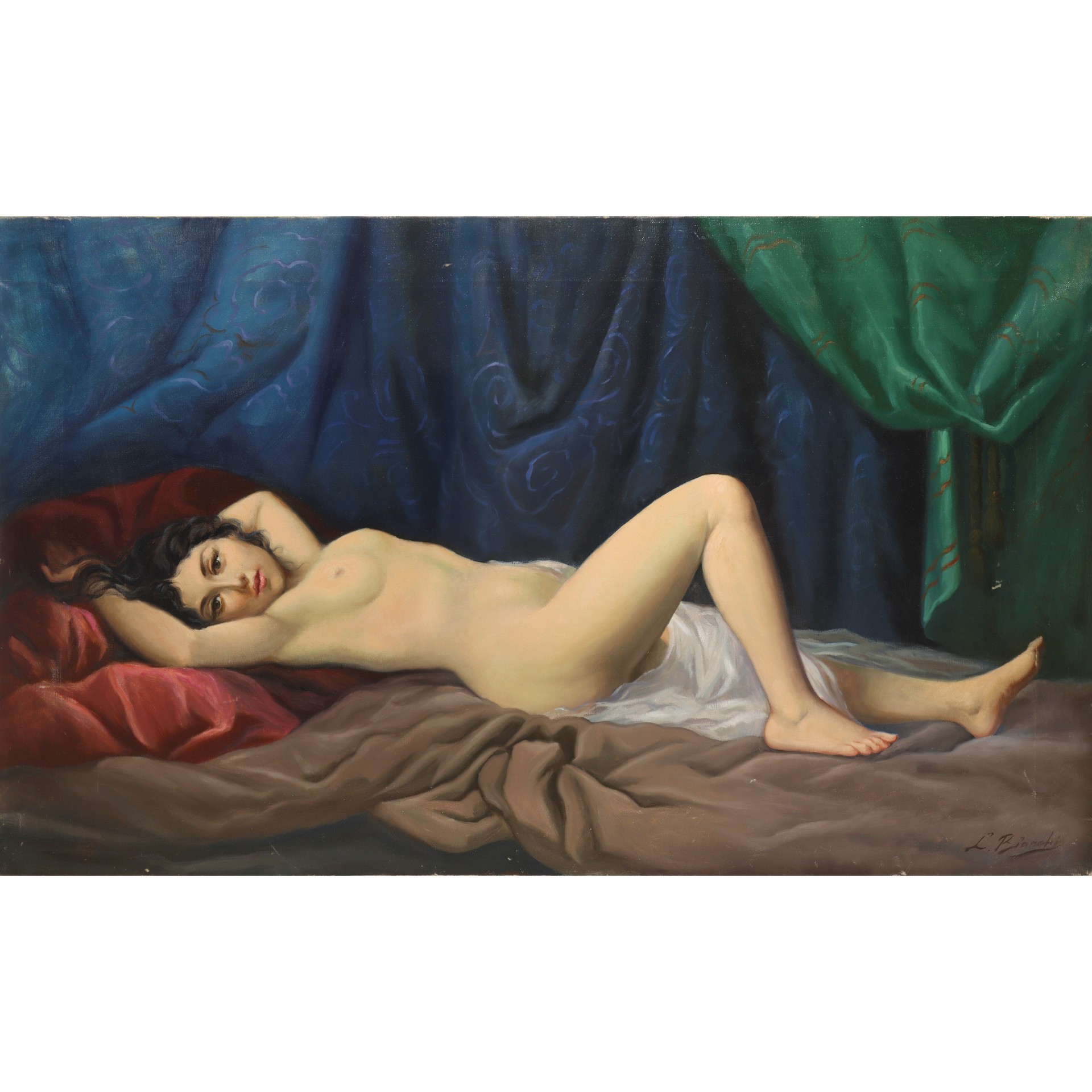 Luigi Bianchi - Nudo di donna adagiata tra tessuti policromi, primi 20° secolo H cm 60x100 Olio su tela