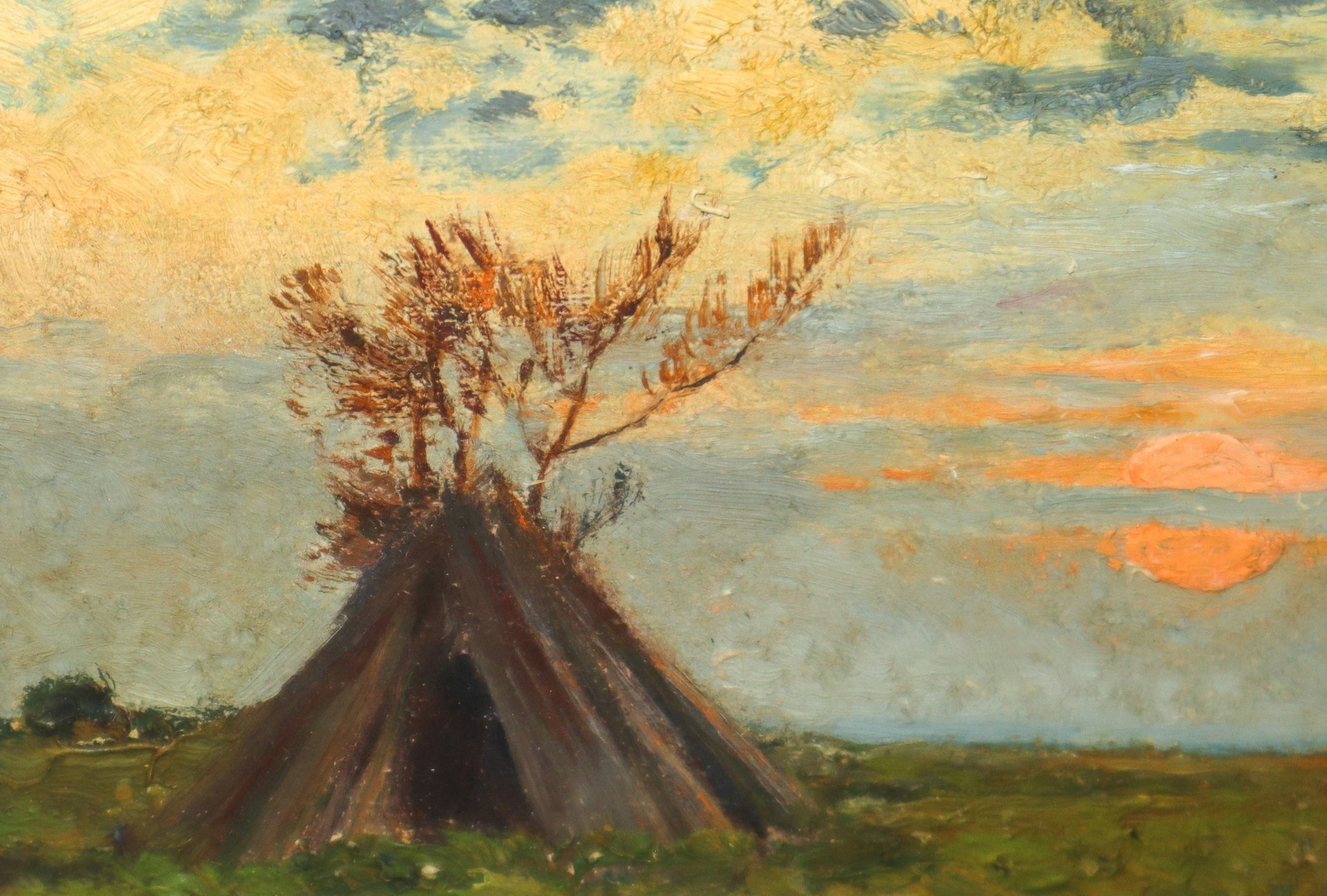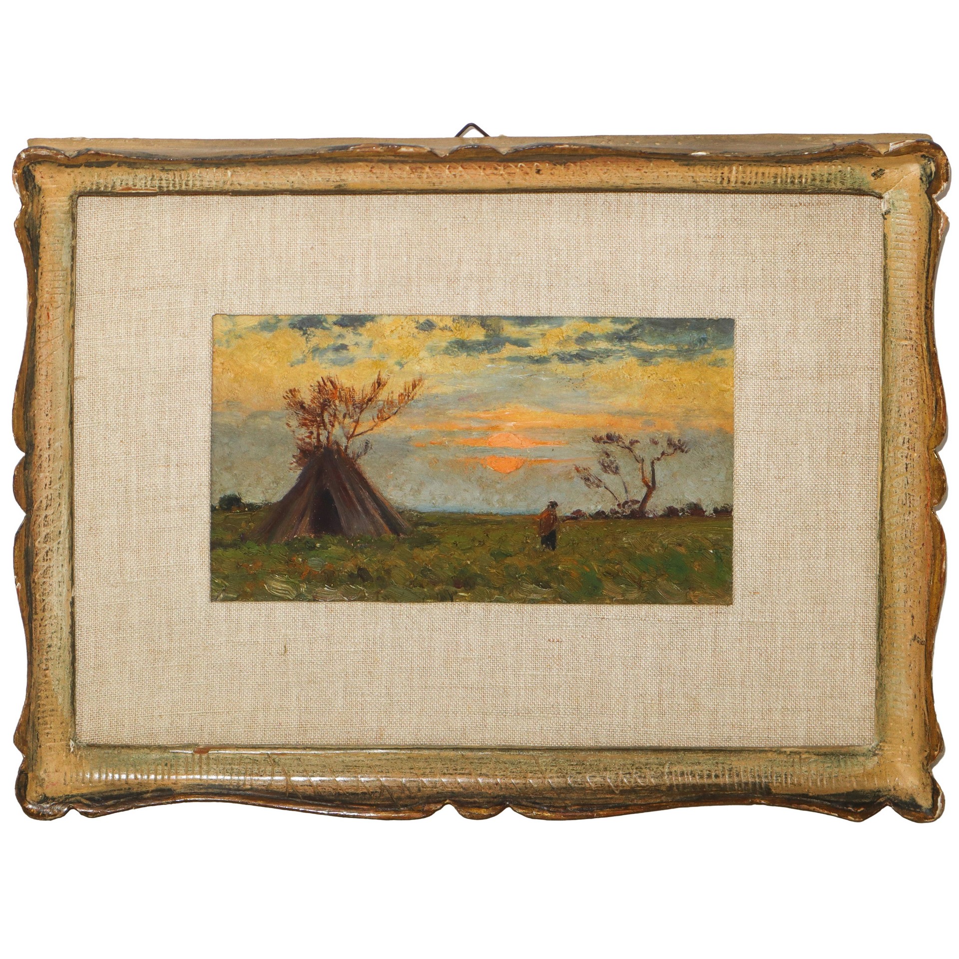 Gennaro Pardo (Castelvetrano 12/04/1865-Castelvetrano 04/09/1927) - Contadina nel campo al tramonto, Montesanto, 03/19/1919 H cm 9.7x17.9 - in cornice H cm 22x30 Olio su tavoletta Firmato al retro con dedica e datato.