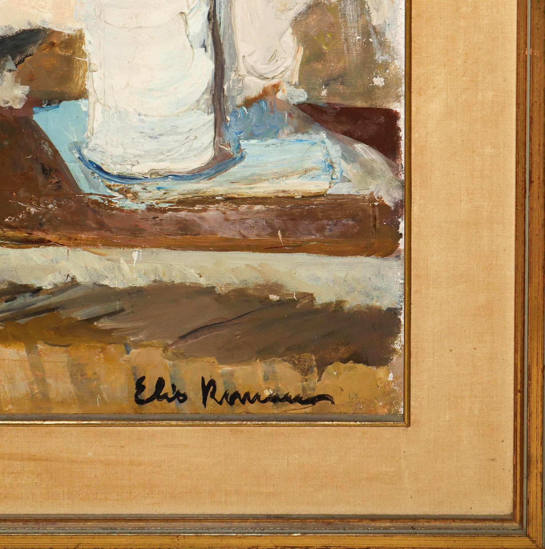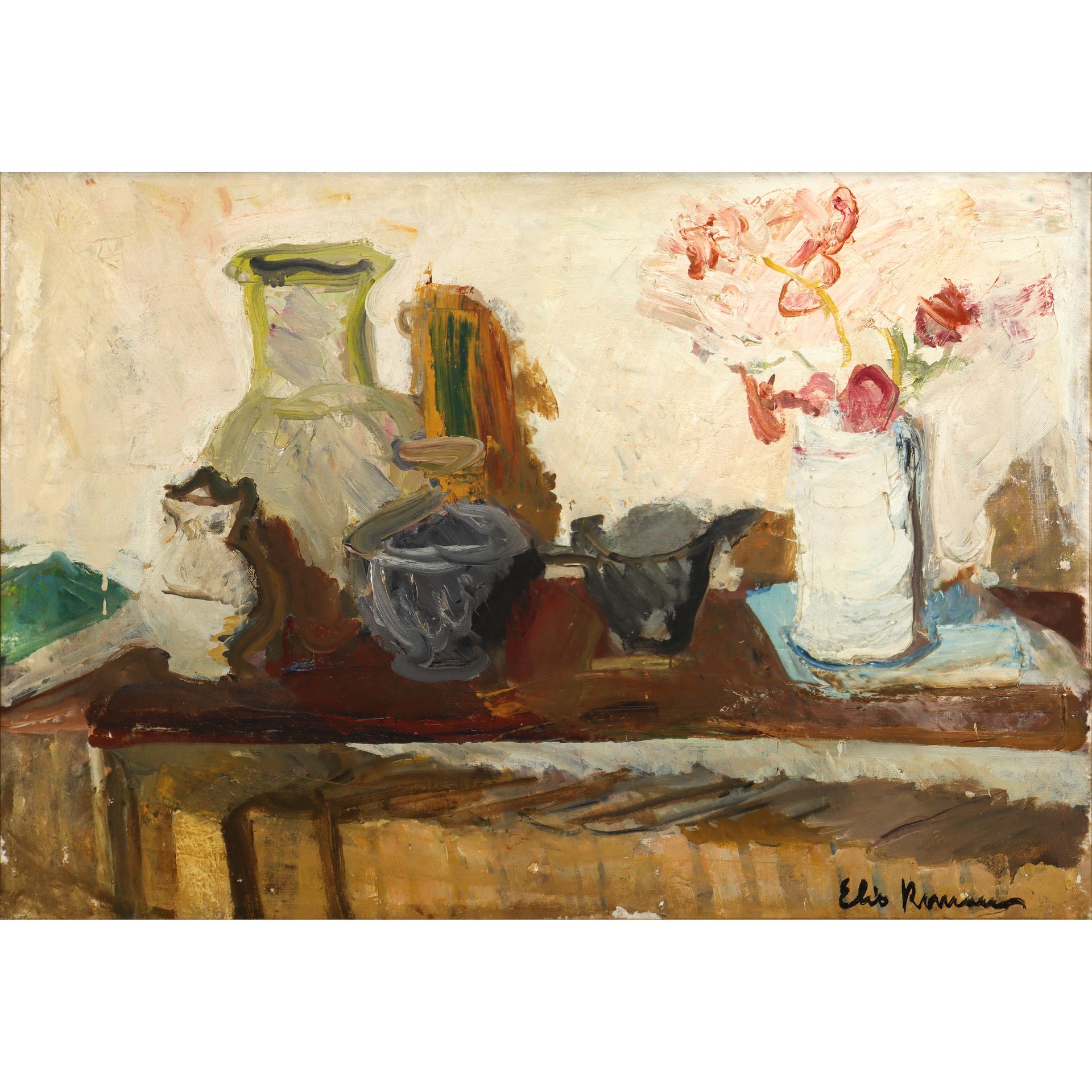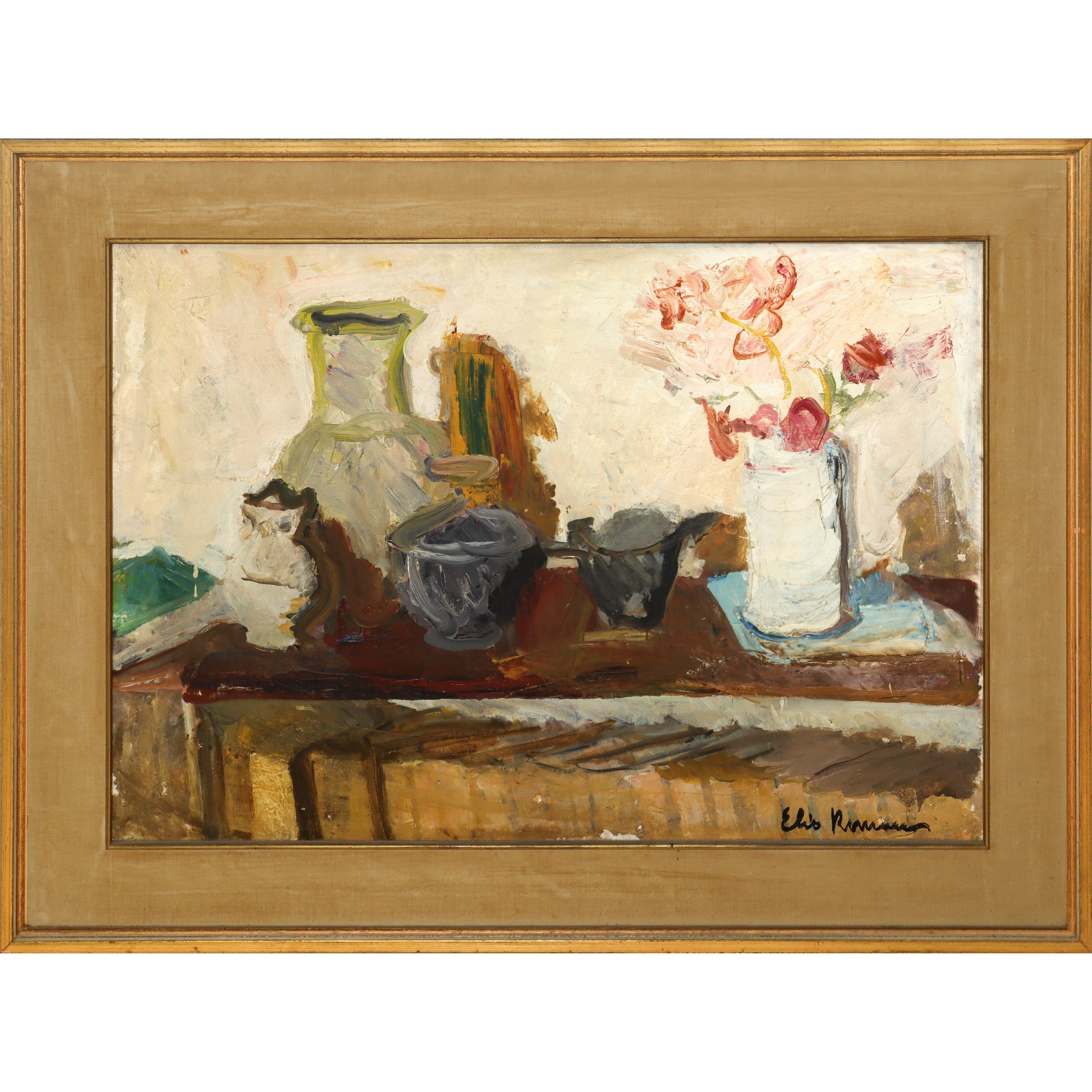 Elio Romano (Trapani 1909-Catania 1996) - Natura morta con vasi H cm 45x66 - in cornice H cm 62.5x82 Firmato in basso a destra.Firmato in basso a destra.
