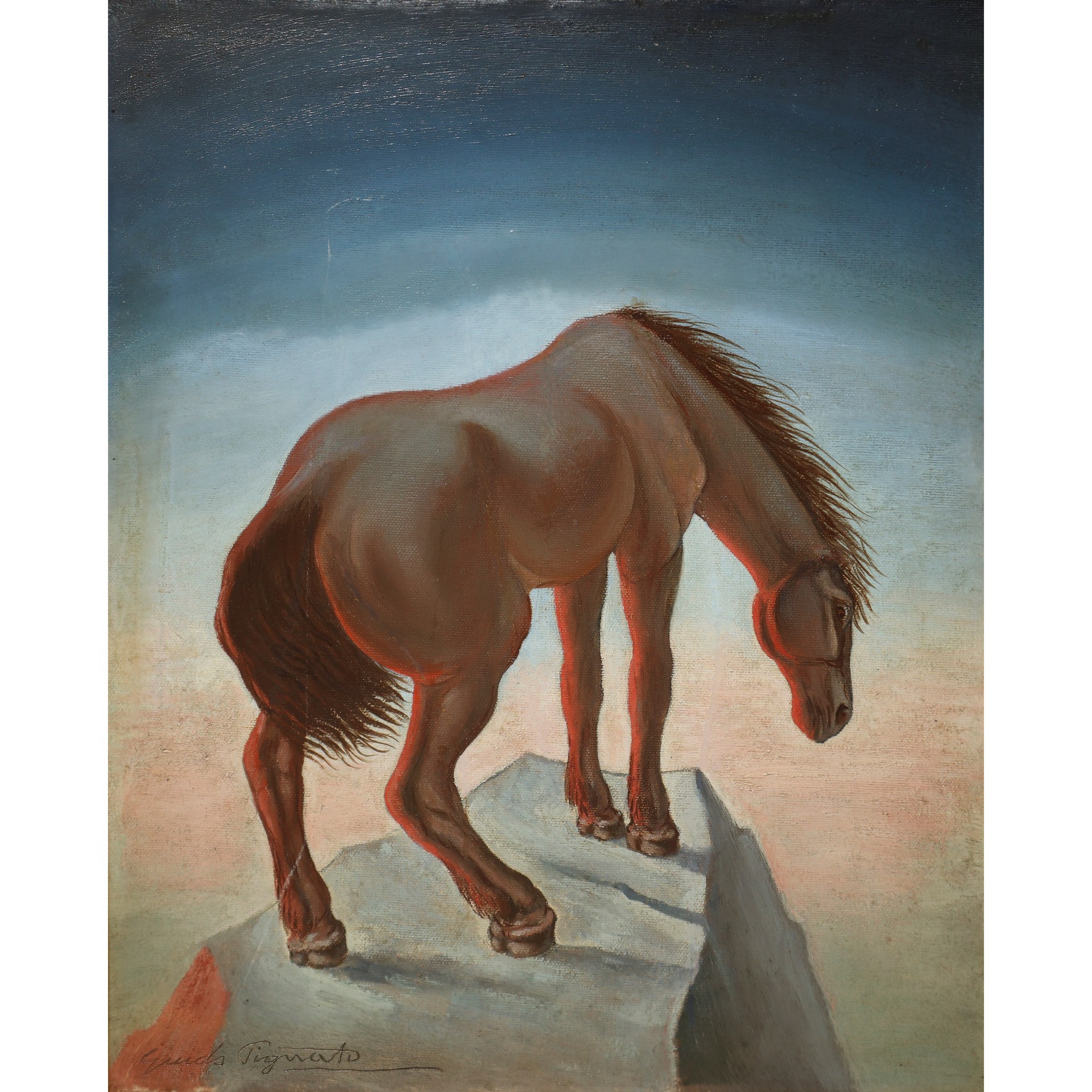 Guido Pignato - Cavallo sull'orlo del burrone, Palermo, 1930 H cm 40x50 - in cornice H cm 57x47 Olio su tela Firmato in basso a sinistra