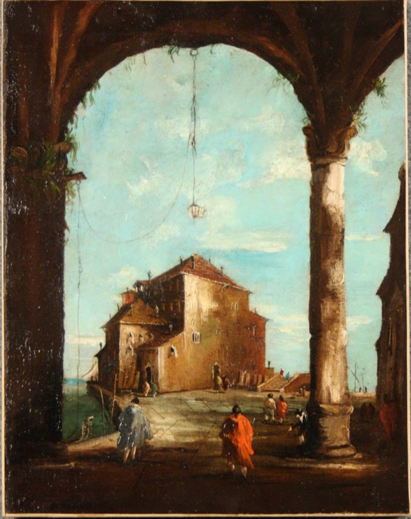 Dipinto olio su tela raff. ''CAPRICCIO VENEZIANO''. Rintelato e rintelaiato. Mis. Lung. cm. 39,5 Alt. cm. 50,5 ca.