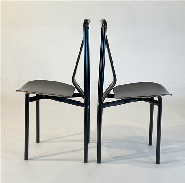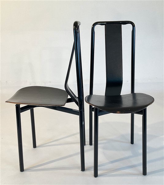 Coppia di sedie modello "Irma". Produzione Zanotta, Italia, 1979. Acciaio verniciato nero e pelle nera. (cm 40x90x46) (difetti)