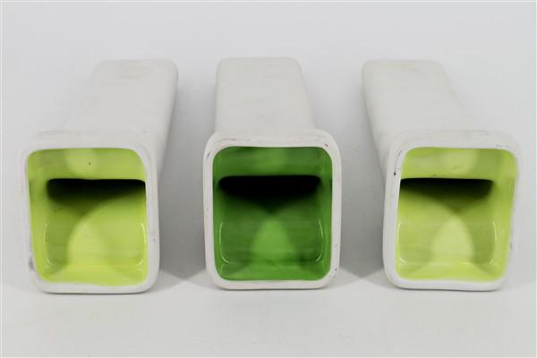 Lotto composto da due vasi in ceramica bianca e rosa e tre contenitori-umidificatori per termosifone. Italia, anni '70. (h max cm 37)