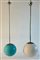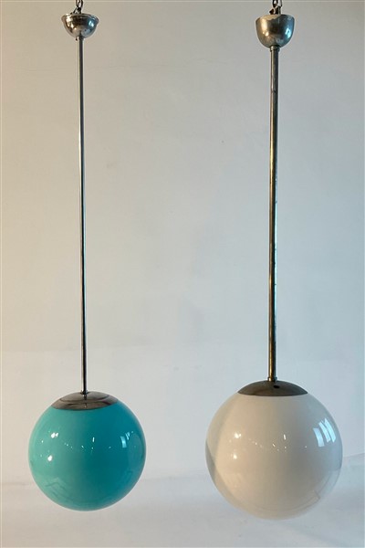 Due lampade a sospensione. Italia, anni '40/'50. Struttura in metallo cromato e globo diffusore in vetro incamiciato lattimo e azzurro. (d cm 24 e 30) (lievi difetti)