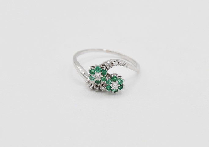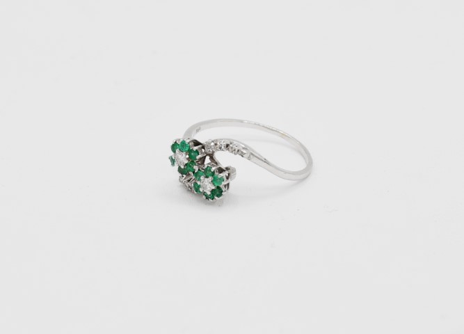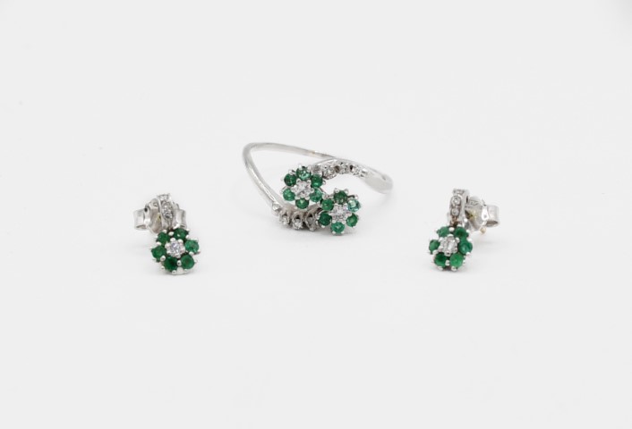 composto da anello contrarie, smeraldi e diamanti per circa 0,15 ct stimati e orecchini con smeraldi e diamanti per circa 0,10 ct stimati