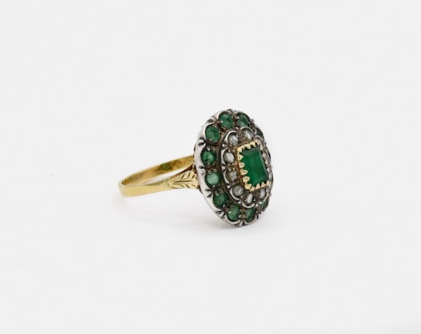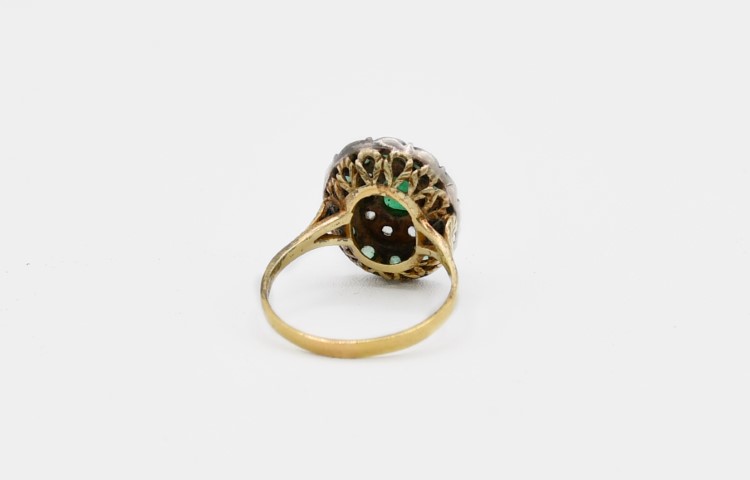 Anello in oro giallo e argento con smeraldi e rosette di diamanti