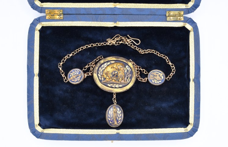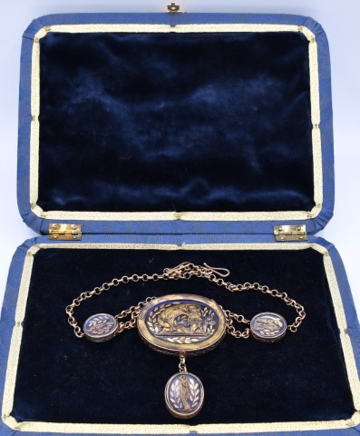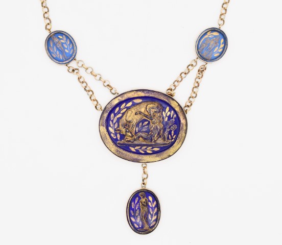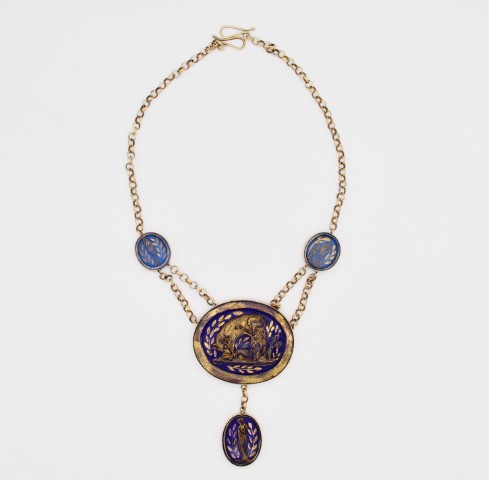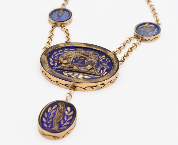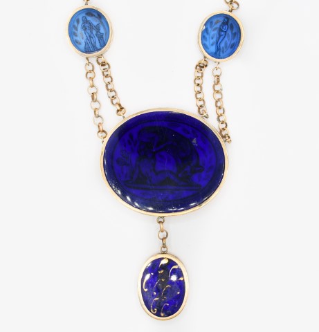 Girocollo in oro basso con grandi 'cammei' in pasta di vetro blu e foglia d'oro
