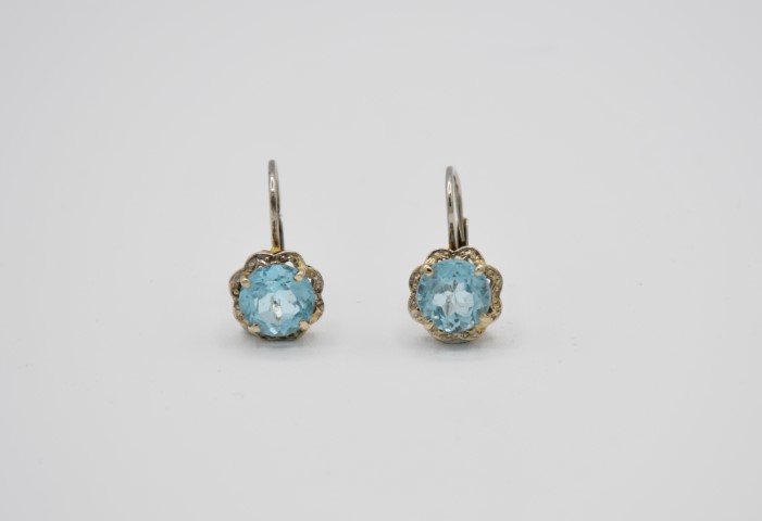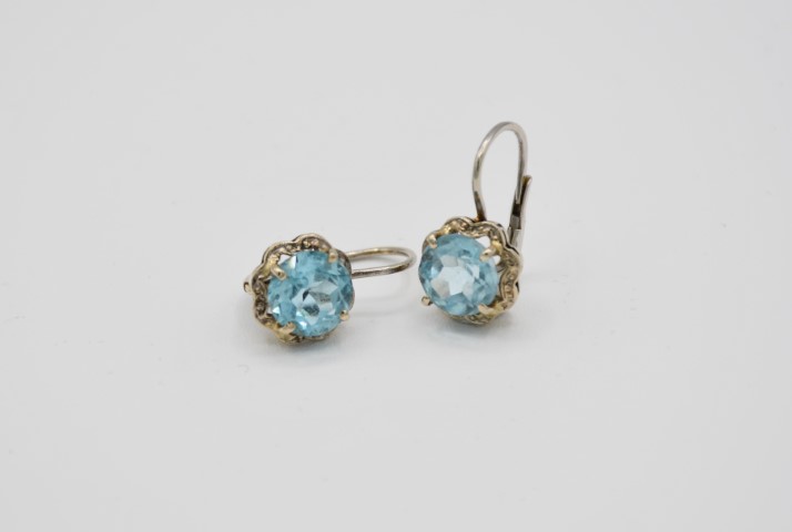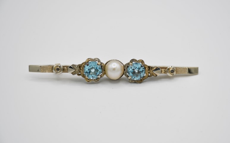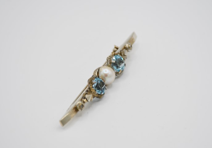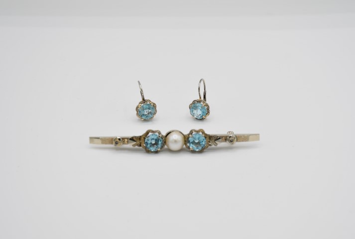 composto da un paio di orecchini e una spilla, realizzato con perla coltivata e paste vitree di color azzurre