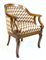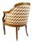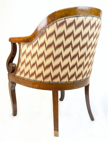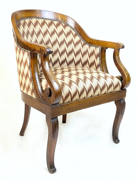 Poltrona a pozzetto con braccioli a ricciolo e gambe mosse, schienale e seduta rivestiti in tessuto fiammato e borchiato. Secolo XIX (difetti)