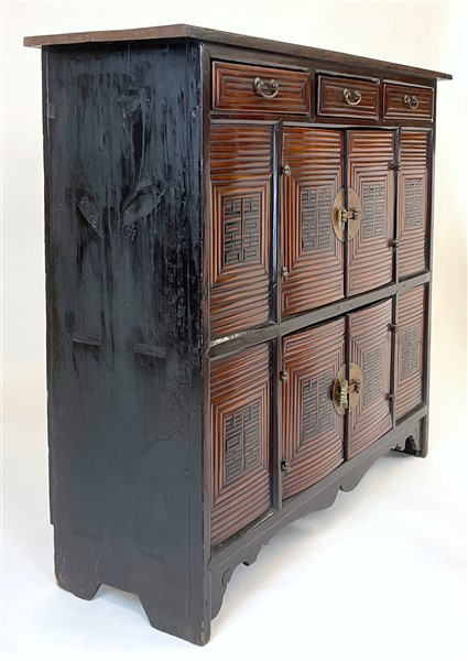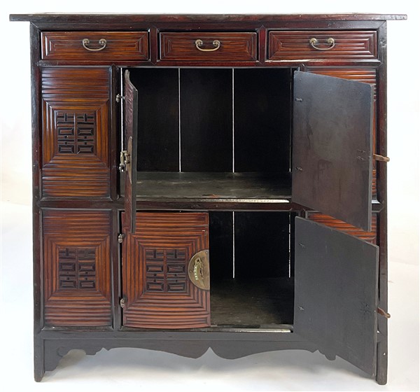 Piccolo mobiletto in legno con cassetti e sportelli e chiusure in metallo Cina