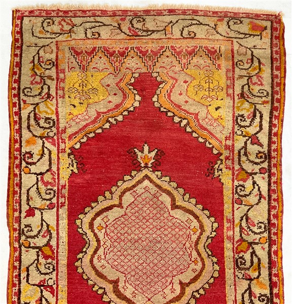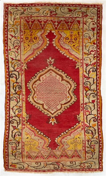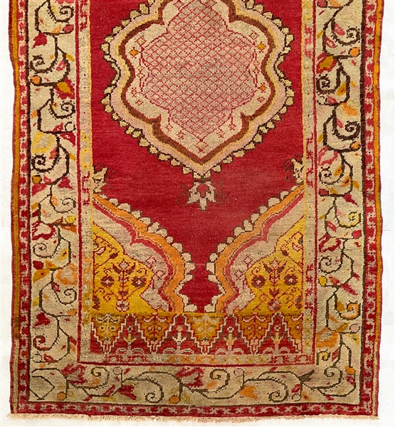 Tappeto Yoruk, Anatolia, fine secolo XIX. Decoro con medaglione polilobato su fondo rosso (cm 176x98) (difetti)