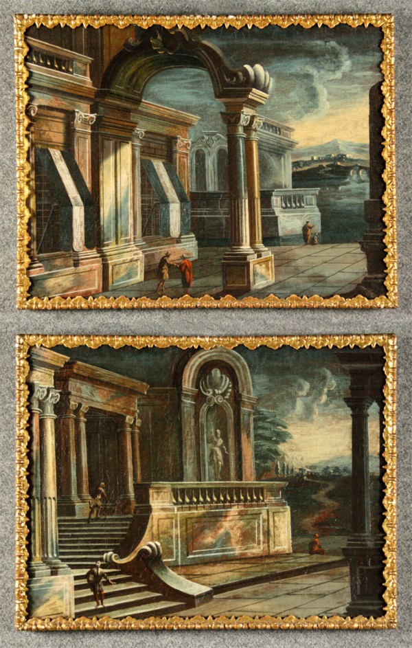AMBITO DI STOM ANTONIO (Nato nel 1688. Morto a Venezia nel 1734). Coppia di dipinti olio su tela raff. ''ARCHITETTURE CON PERSONAGGI''. In cornice. Rintelati e rintelaiati. Mis. Lung. cm. 52 Alt. cm. 40 ca.