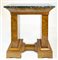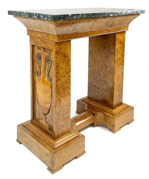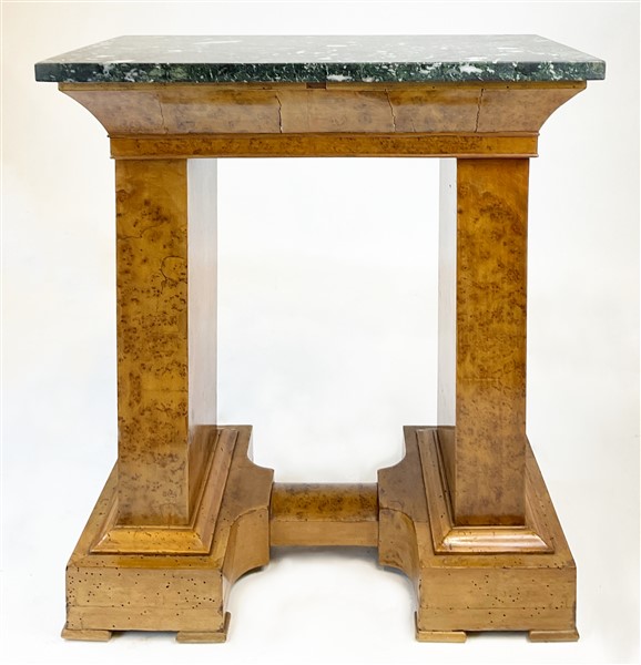 Tavolino lastronato in radica di tuia, montanti decorati da anfore intagliate a rilievo uniti da traversa, fine secolo XIX. Piano in marmo verde Alpi di epoca successiva (cm 72x77x41) (difetti e piccoli restauri)