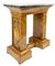 Tavolino lastronato in radica di tuia, montanti decorati da anfore intagliate a