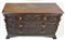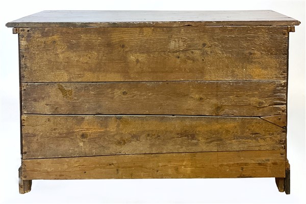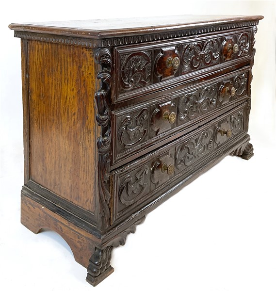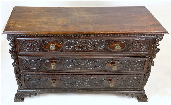 Cassettone in legni vari con fronte a tre cassetti decorati da intagli a volute, montanti di simile decoro, bordura unghiata e piedi ferini. Friuli, secolo XVII (cm 142x87x52) (difetti e restauri)