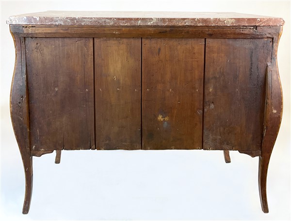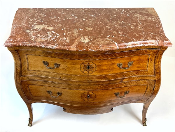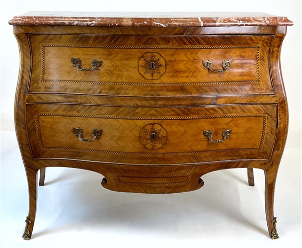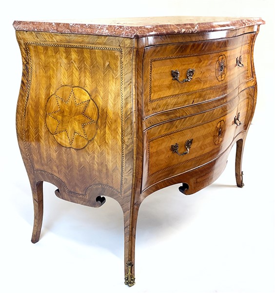 Cassettone di forma bombata, lastronato ed intarsiato in bois de rose e legni di varie essenze con motivi a stella entro riserve con filettature, fronte a due cassetti e grembiale sagomato, piano in marmo sagomato. Napoli, secolo XVIII (cm 120x93x60) (difetti)